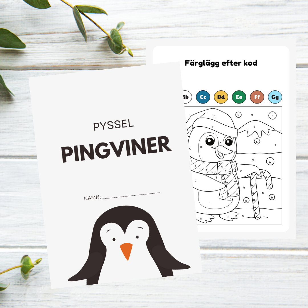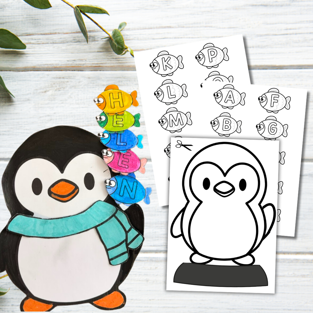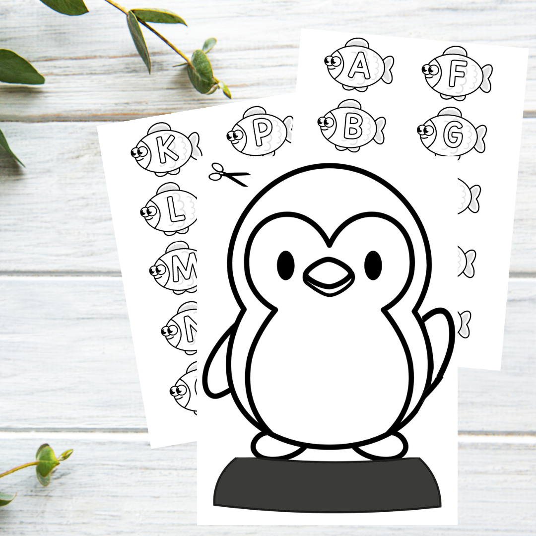 Här finns en pysseluppgift med en pingvin och alfabetet som fiskar. Klipp ut pingvinen, halsduken och fiskarna och måla dem i olika färger. Skriv tillexempel ditt namn med bokstäverna och sätt fast dem på pingvinen.