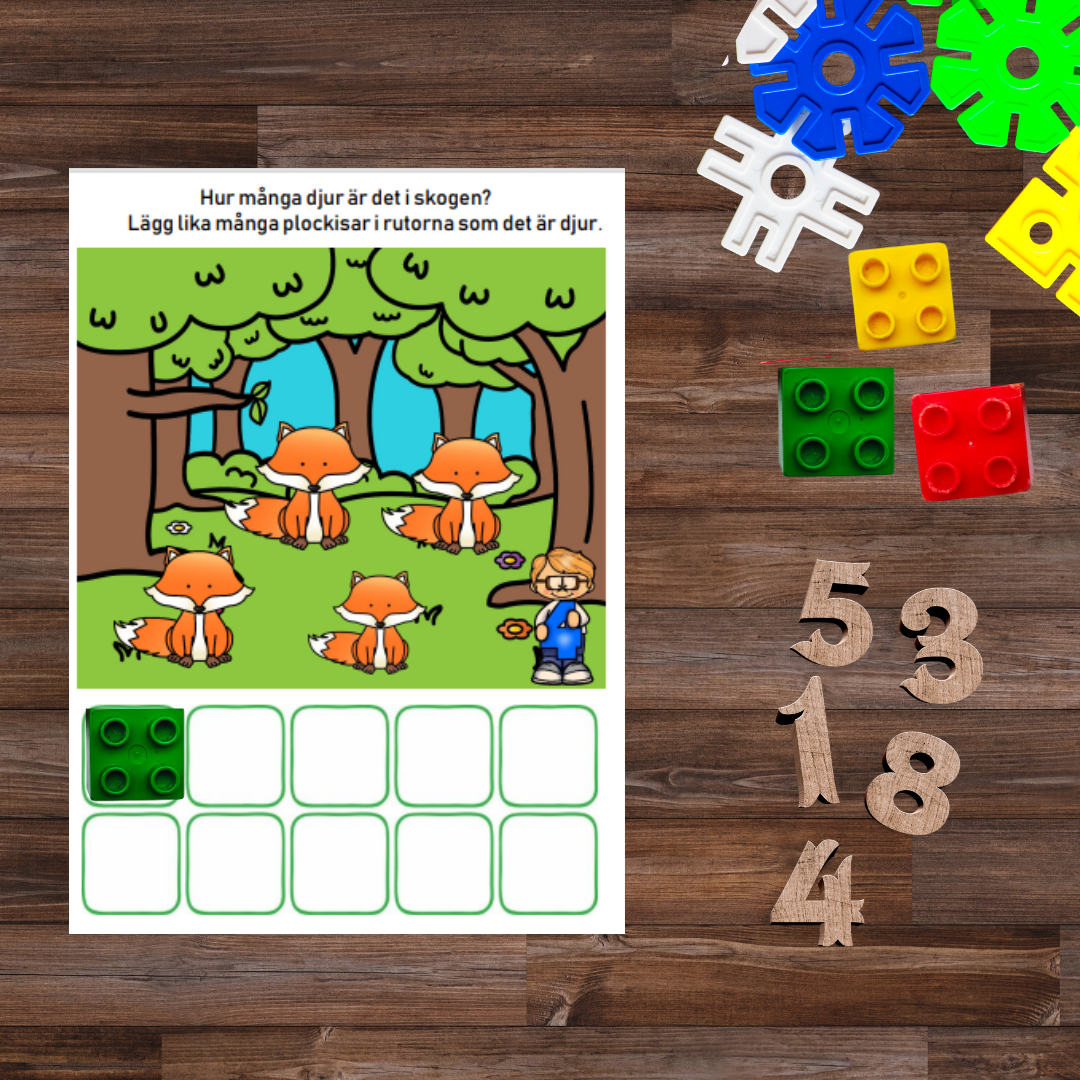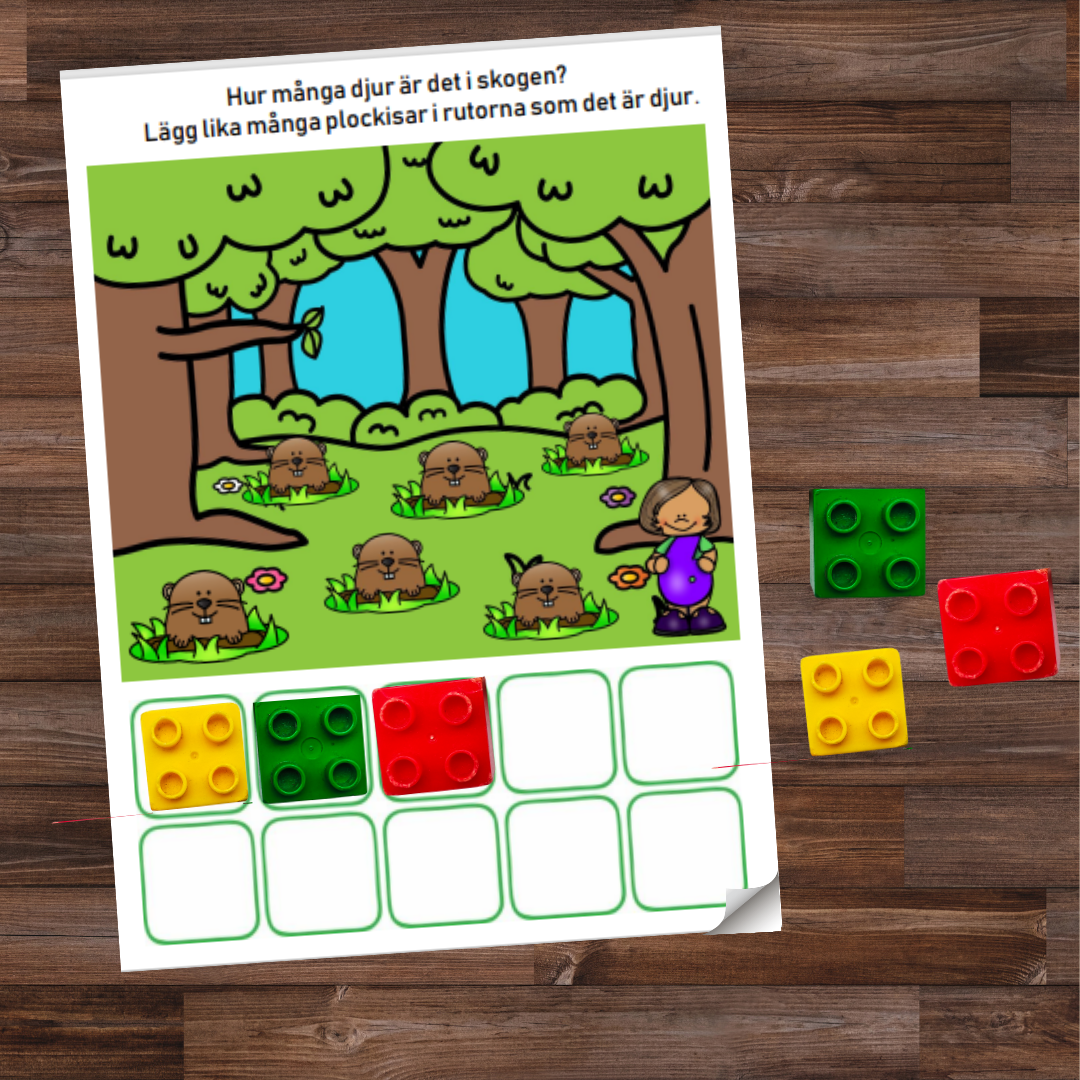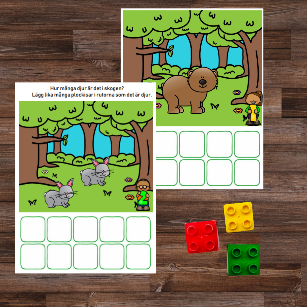 Här finns 10 olika bilder med djur i skogen. Räkna djuren och lägg lika många klossar i rutorna under.