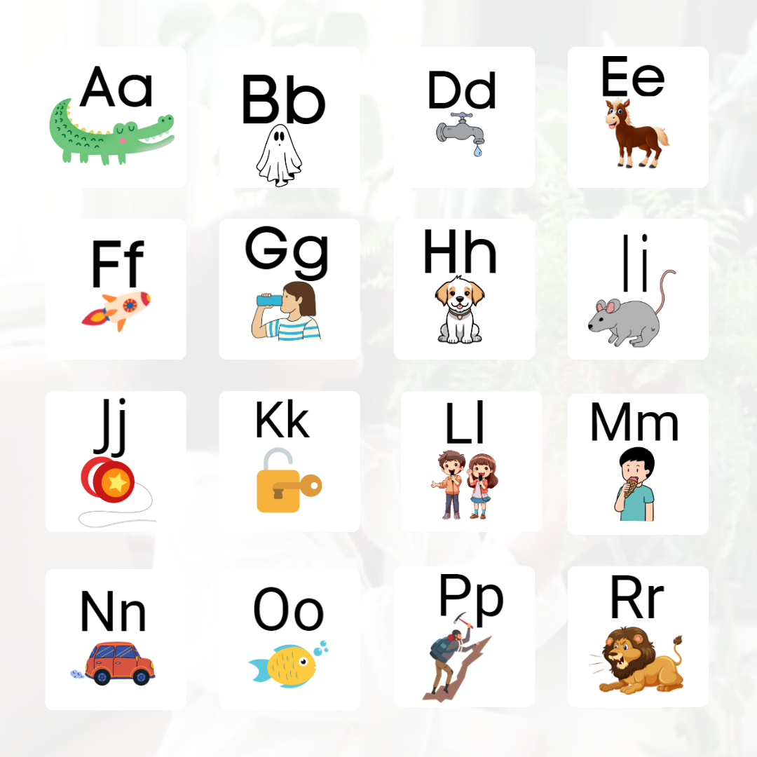 A är krokodilen som gapar och låter /a/, B är spöket som låter /b/, D är kranen som droppar /d/.....