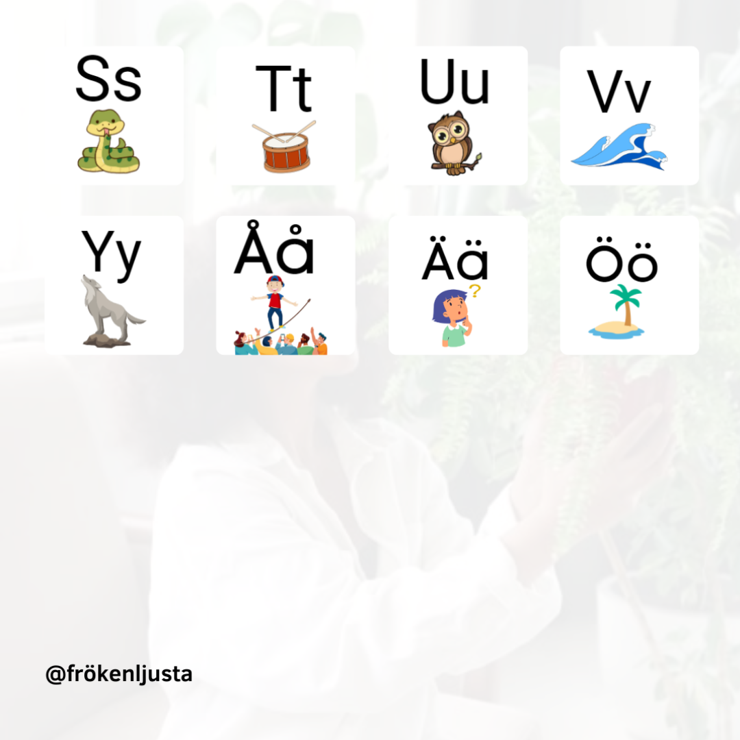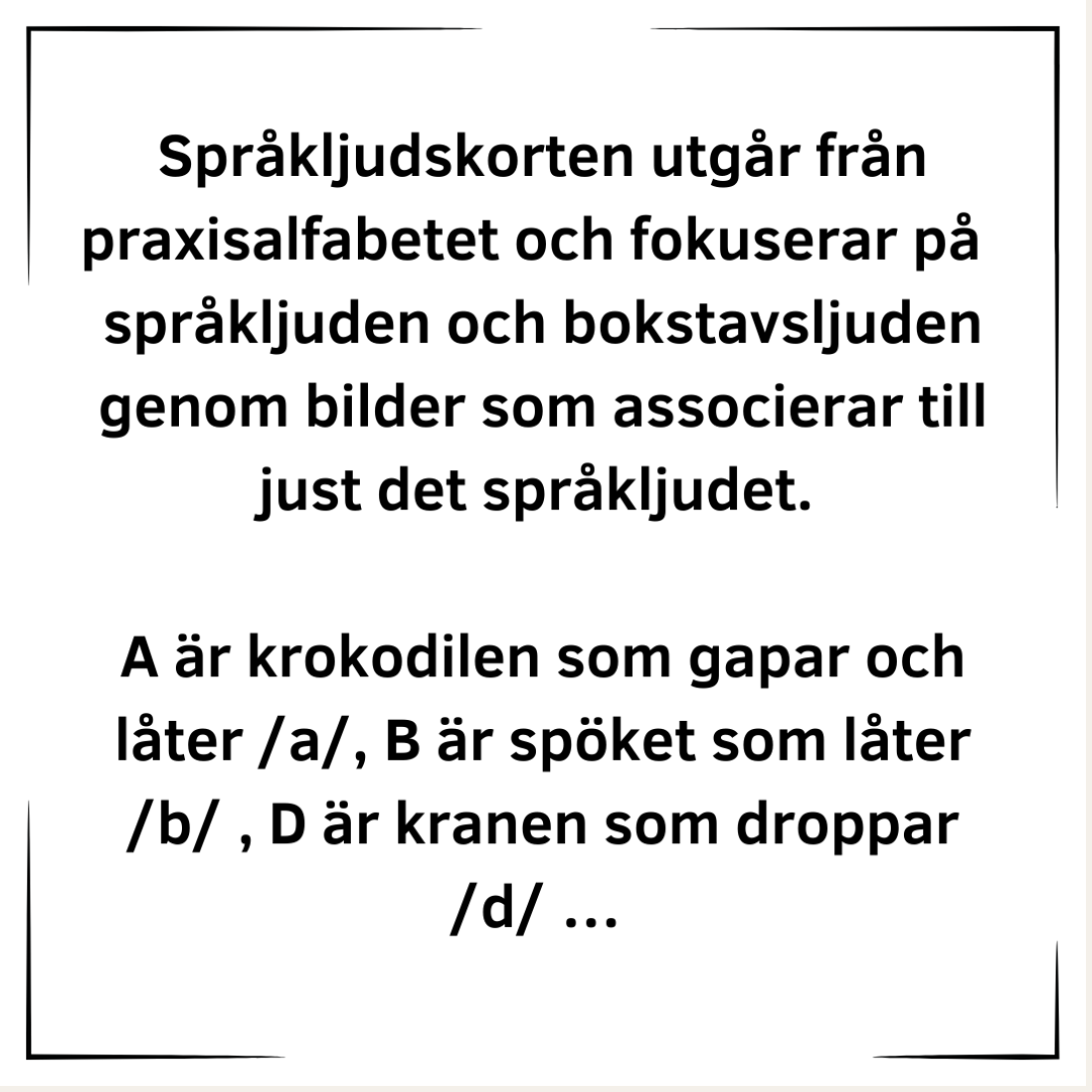 Här finns språkljudskort a - ö som utgår från Praxisalfabetet. Materialet fokuserar på språkljuden och bokstavsljuden genom bilder som associerar till just det språkljudet.
