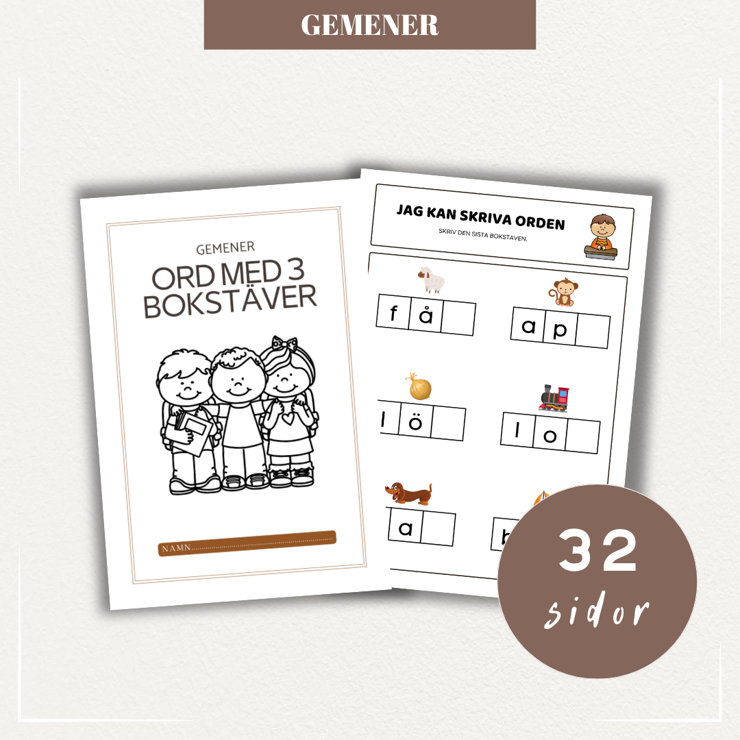Här finns ett material som tränar att skriva ord med tre bokstäver med gemener. Skriv den första bokstaven i ordet som saknas, sedan den mittersta bokstaven och sedan den sista bokstaven som saknas. Avsluta med att skriva ordet själv. Med en långsam progression ges alla tillfällen att lyckas och tycka att det är roligt att lära sig.