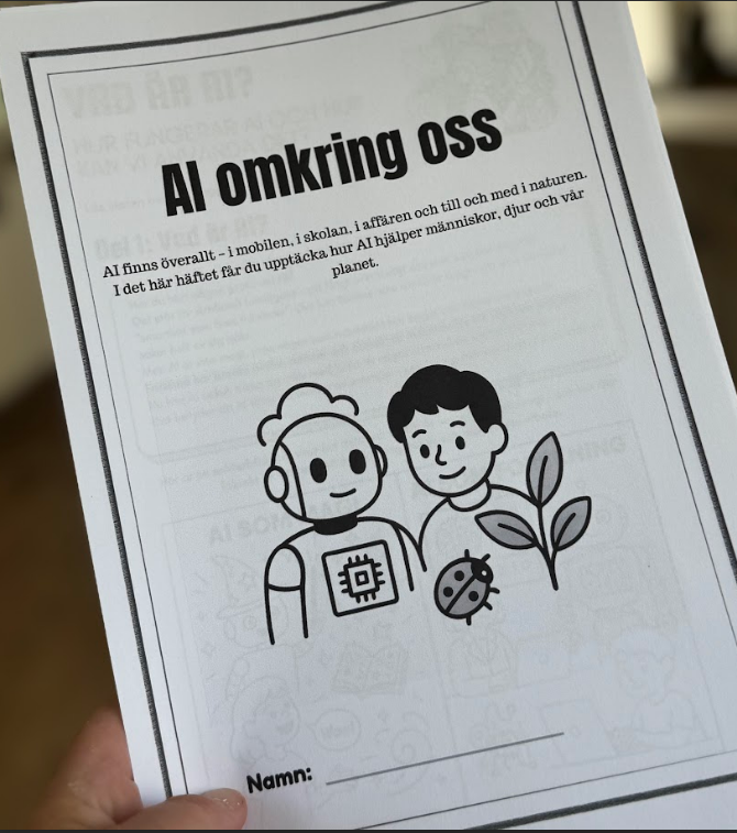 “AI i samhället” är ett pedagogiskt material som ger barn i åldern ca 7–12 år en introduktion till vad AI är, hur det används i vardagen, i naturen och bland djur – och varför det är viktigt att tänka kritiskt och ansvarsfullt.