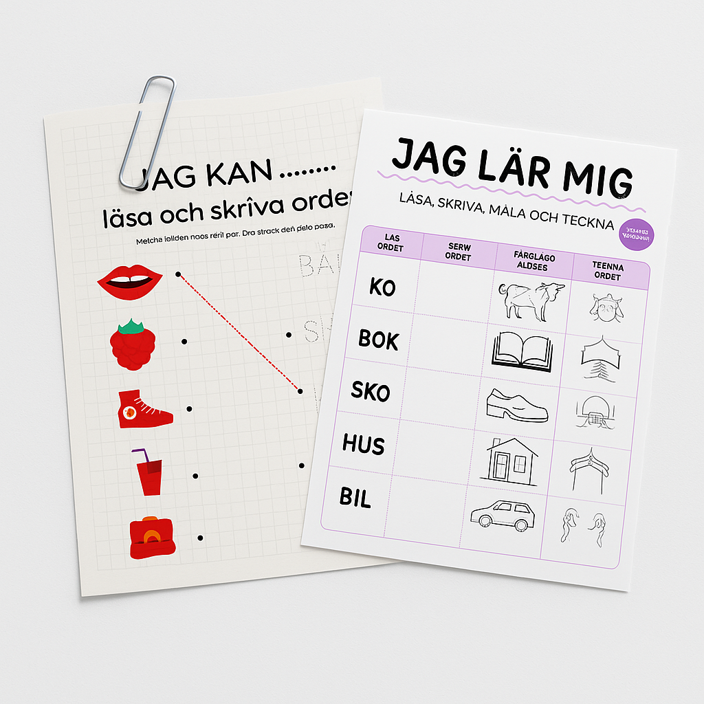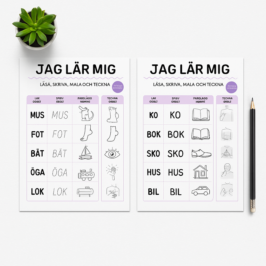 Här hittar du tre olika häften som passar perfekt för barn i början av sin läs- och skrivresa. Materialet har tydligt bildstöd och en långsam, trygg progression som gör det lätt att hänga med. Pedagogiskt upplagt för att stärka både självkänsla och kunskap – steg för steg.