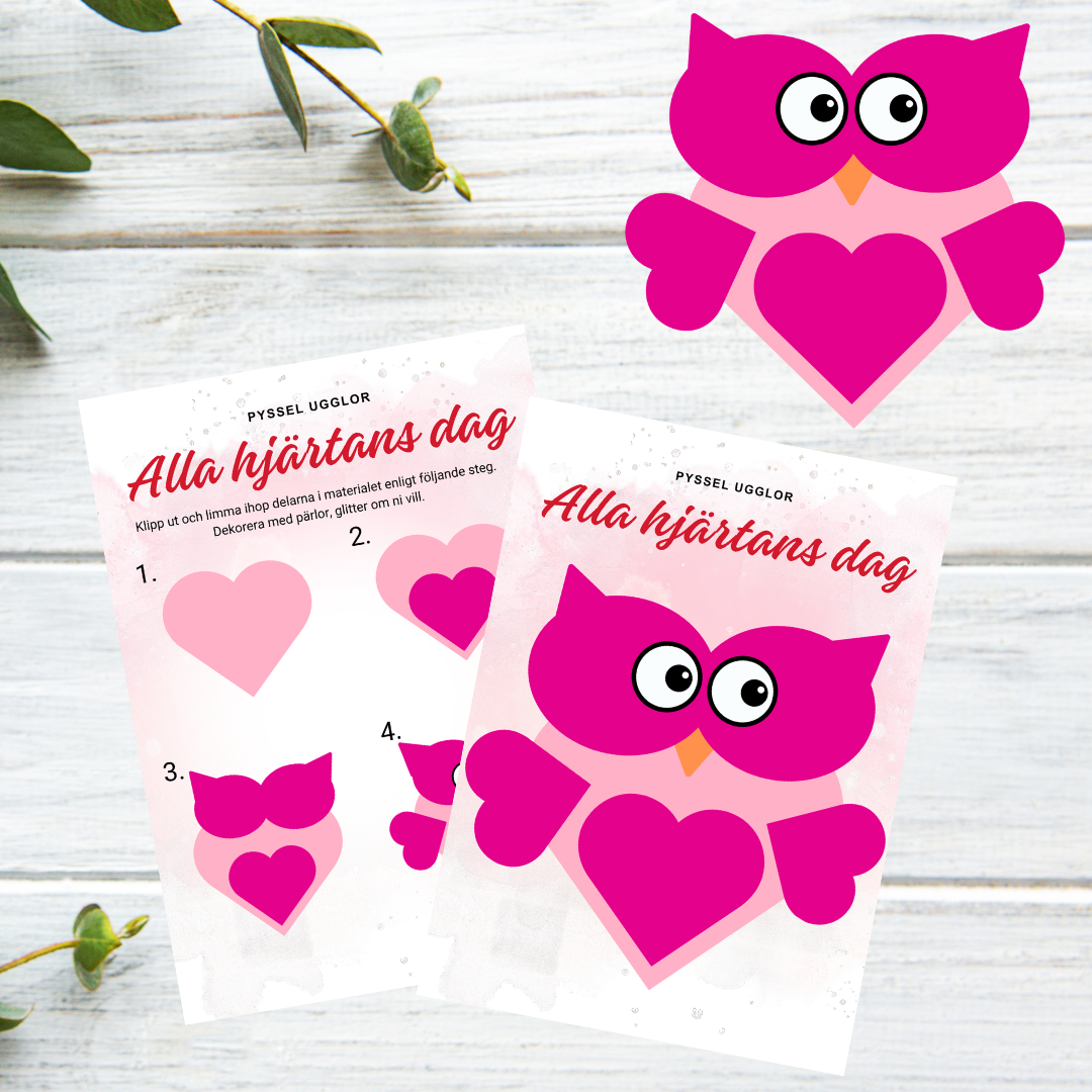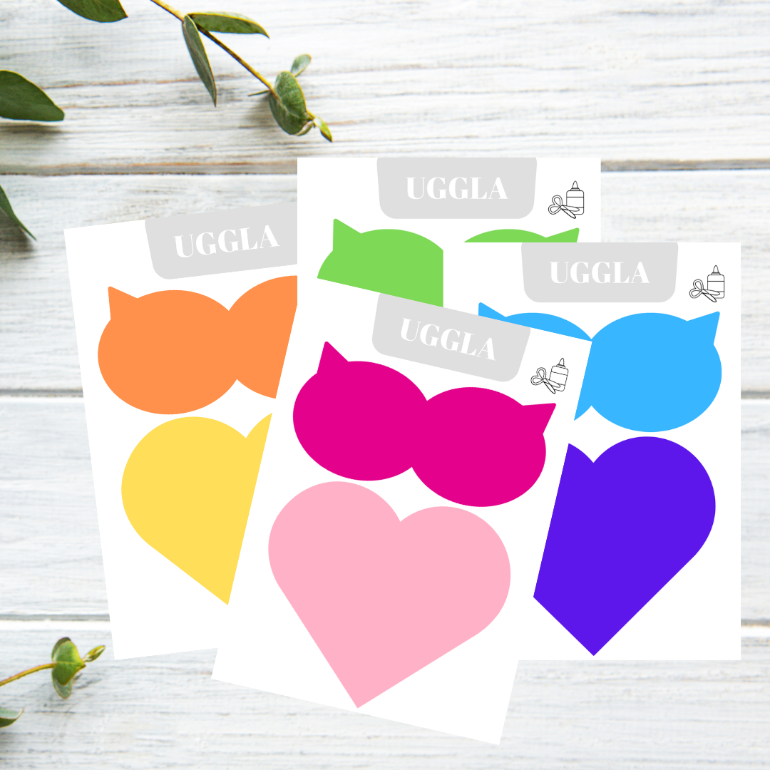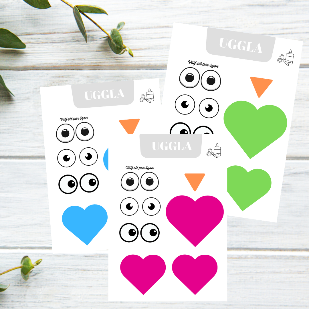 Här finns ugglor i fyra olika färger plus en vit att färglägga i vilka färger man vill. Klipp ut de olika delarna till ugglorna och sätta ihop till den allra finaste alla hjärtans dag ugglan. Dekorera ugglan med pärlor, glitter eller något annat ni har hemma om ni vill.