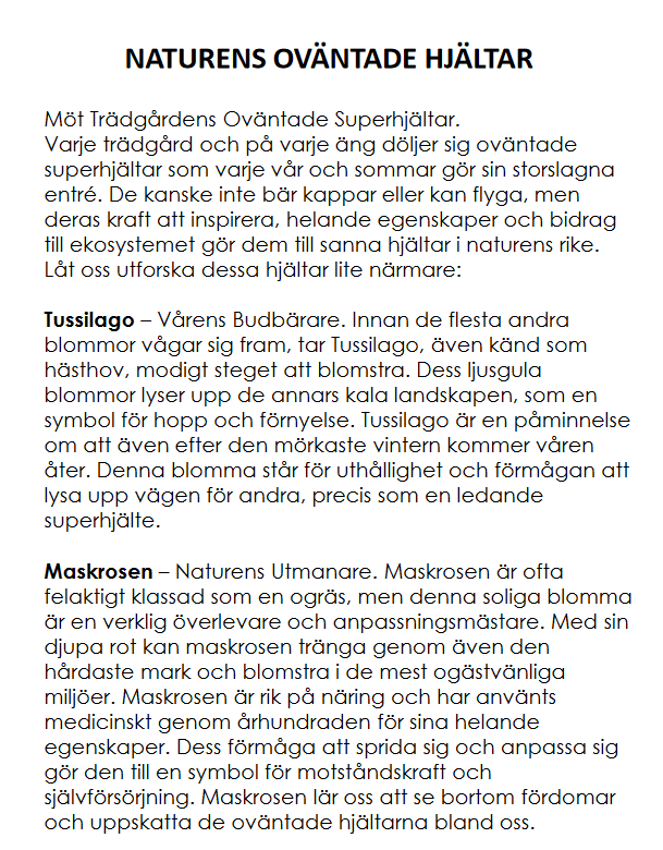 Med det här materialet kan du utforska några av dessa blomstrande hjältar, gestaltade som superhjältar. Till varje blomma finns en kort beskrivning av blommans egenskaper, dessa oväntade superhjältar som varje vår och sommar gör sin storslagna entré. De kanske inte bär kappor eller kan flyga, men deras kraft att inspirera, helande egenskaper och bidrag till ekosystemet gör dem till sanna hjältar i naturens rike. Låt oss utforska dessa hjältar lite närmare: