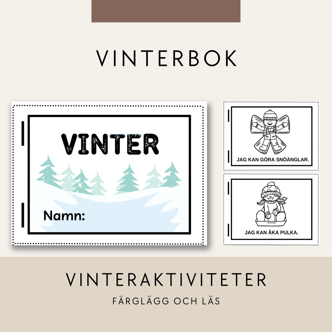 Här kan du göra en egen bok som handlar om saker du kan göra på vintern. Klipp ut sidorna och häfta ihop till en bok. Färglägg bilderna och sedan kan du läsa och berätta boken för en kamrat.
